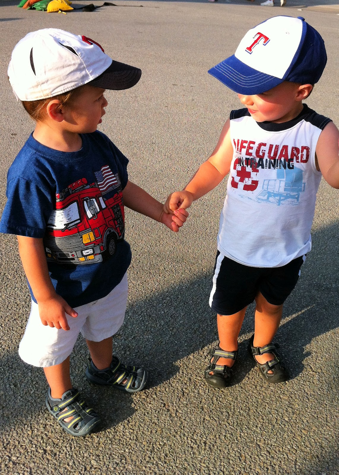 I was extremely hot and if we hadn't told Jack that we were going to see James we probably would have left after we had been there about 20 minutes. But all Jack kept saying was "James, see James?" Below is James and Jack holding hands. I have no idea how this started but they were so cute.