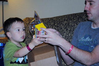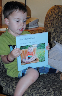 We decided to open gifts before we went to dinner. Most of the things we got Jack were sort of practical gifts. Texas Rangers shirts, piggy bank, and Jack's "Second Year Blog Book".