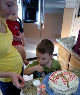 Jack has just recently started enjoying sweets. He wanted to help put the sprinkles on his cake. I made this cake the night before and I guess there was an earthquake or something. :) Somehow it split and ended up looking like a peace sign.