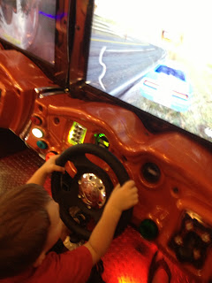We visited the game room before we left. Jack just pretended to play these games. We were going to Chuck E Cheese the next day.