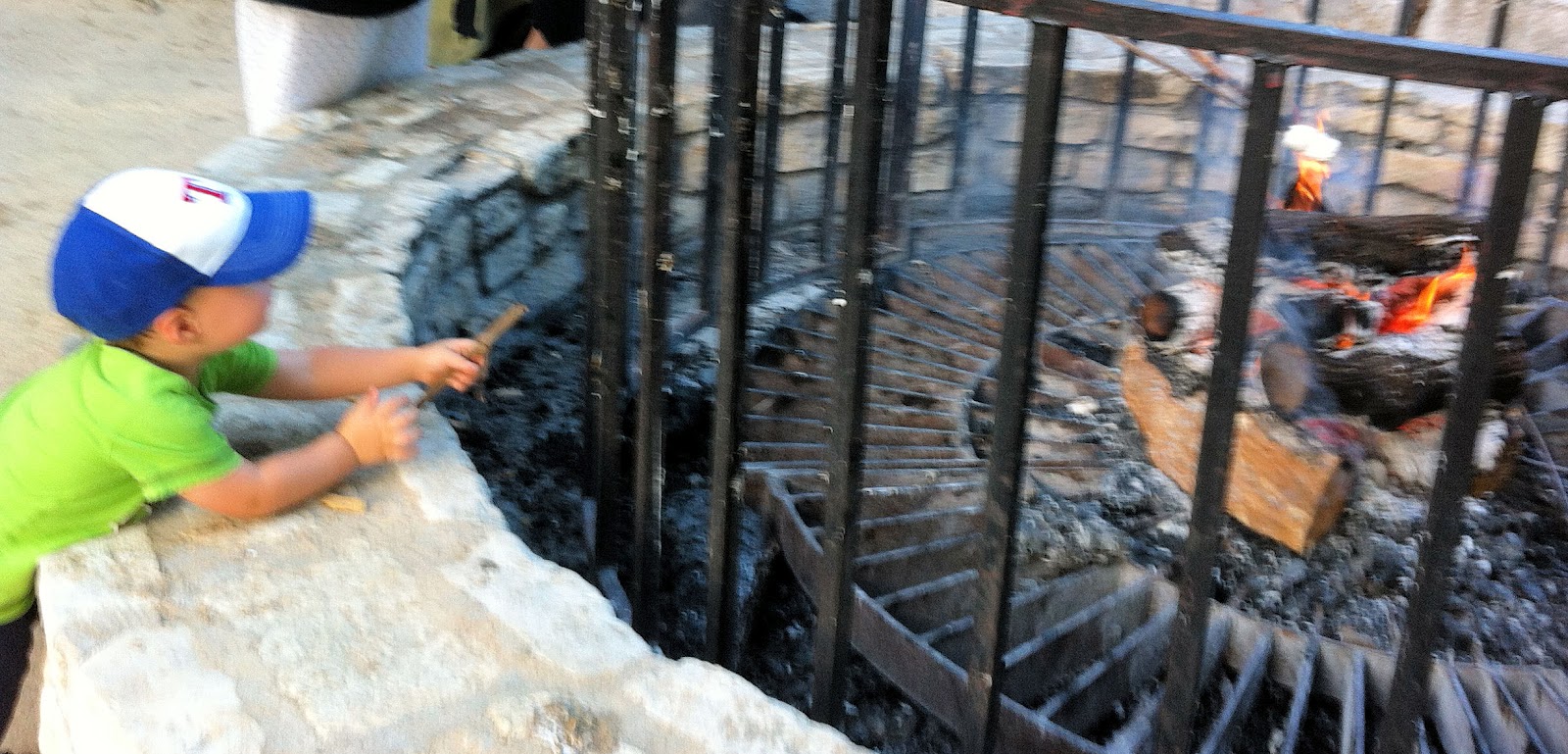 Each night they have S'mores available (for free). Everyone gets to toast their own marshmallows. Jack saw me toast mine so he wanted to get his own stick and pretend to toast one for himself.