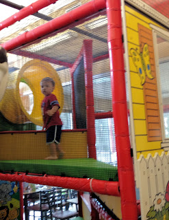 It took Jack a little while to get used to/comfortable with the water. So we first went in the lazy river. I put Jack on Ben's lap and we rode in tubes on the river. Jack seemed to really like this and was very relaxed. Then we headed over to the kiddie pool and Jack had tons of fun jumping in the pool holding Daddy's hands.
