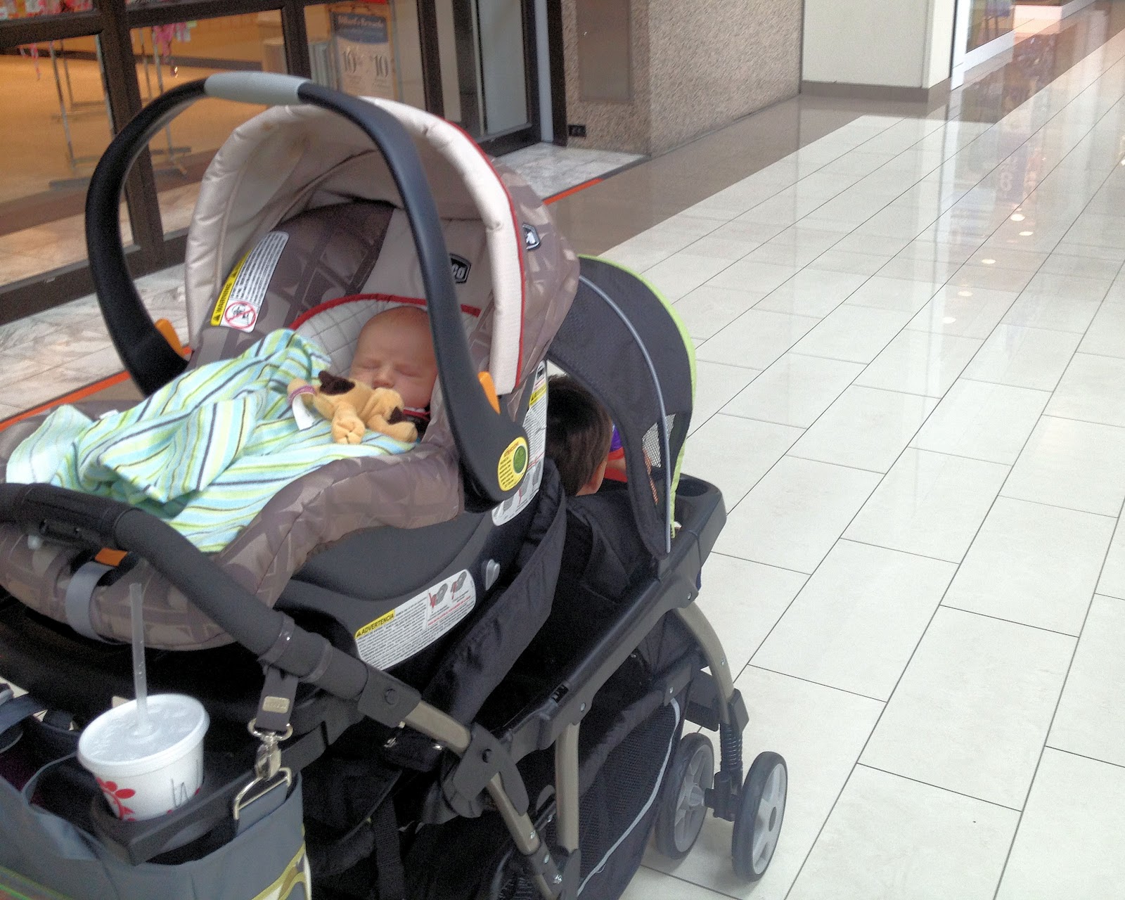 First stroller ride. We went to the mall as a family around 9am to join the mall walkers. Jack is in the front of the double stroller.
