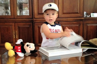 Cute picture of Jack reading daddy's sports coffee table book and wearing daddy's Dallas Mavericks visor.