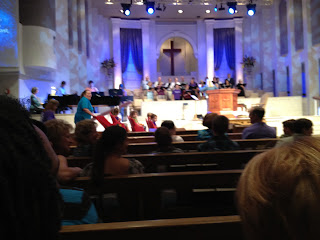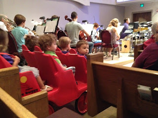 The first Sunday after Kyle was born was Preschool parade day at church. During one of the songs in the service, all of the preschool classes parade through either on foot, in strollers, or in buggies. This is to help recruit preschool workers. Jack is in this red buggy front right seat.