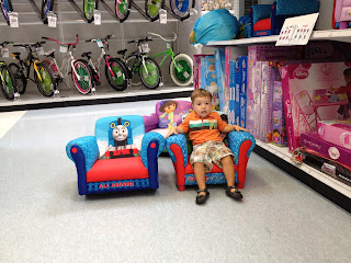 We were at the square for maybe 10 minutes. The Apple store couldn't help Ben's phone. We thought since we were out there, let's stop by the Babies R Us nearby and look at a double stroller. While I was looking at the strollers, daddy and Jack roamed the nicest Babies R Us/Toys R Us I had ever been to. I guess if you are a store in a city where people have lots of money, you have to be really clean and fancy. Anyway, here are some photos of Jack having fun.