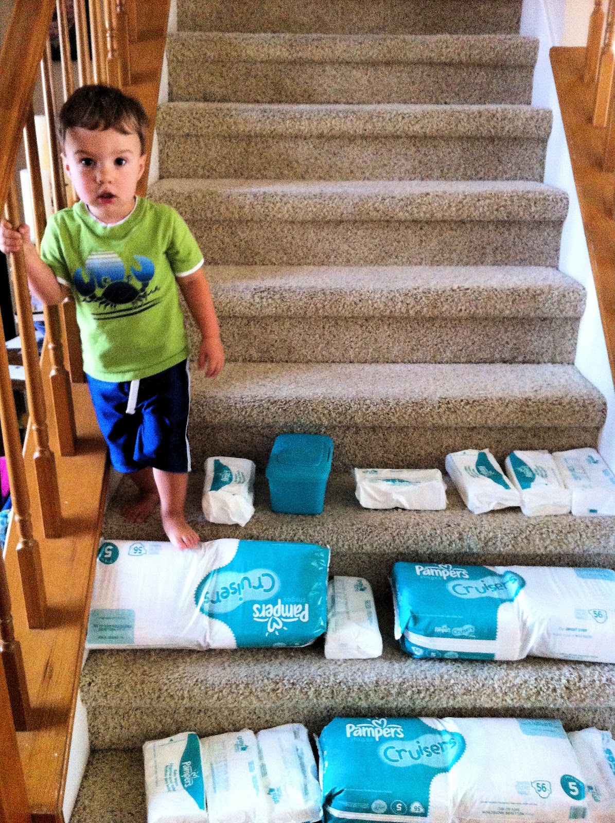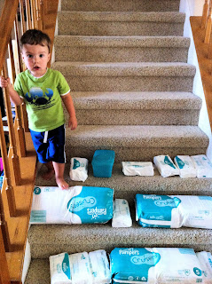 Helping put wipes and diapers on the stairs to take to his room. Love Amazon subscribe and save!
