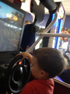 We visited the game room before we left. Jack just pretended to play these games. We were going to Chuck E Cheese the next day.
