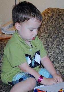 We decided to open gifts before we went to dinner. Most of the things we got Jack were sort of practical gifts. Texas Rangers shirts, piggy bank, and Jack's "Second Year Blog Book".