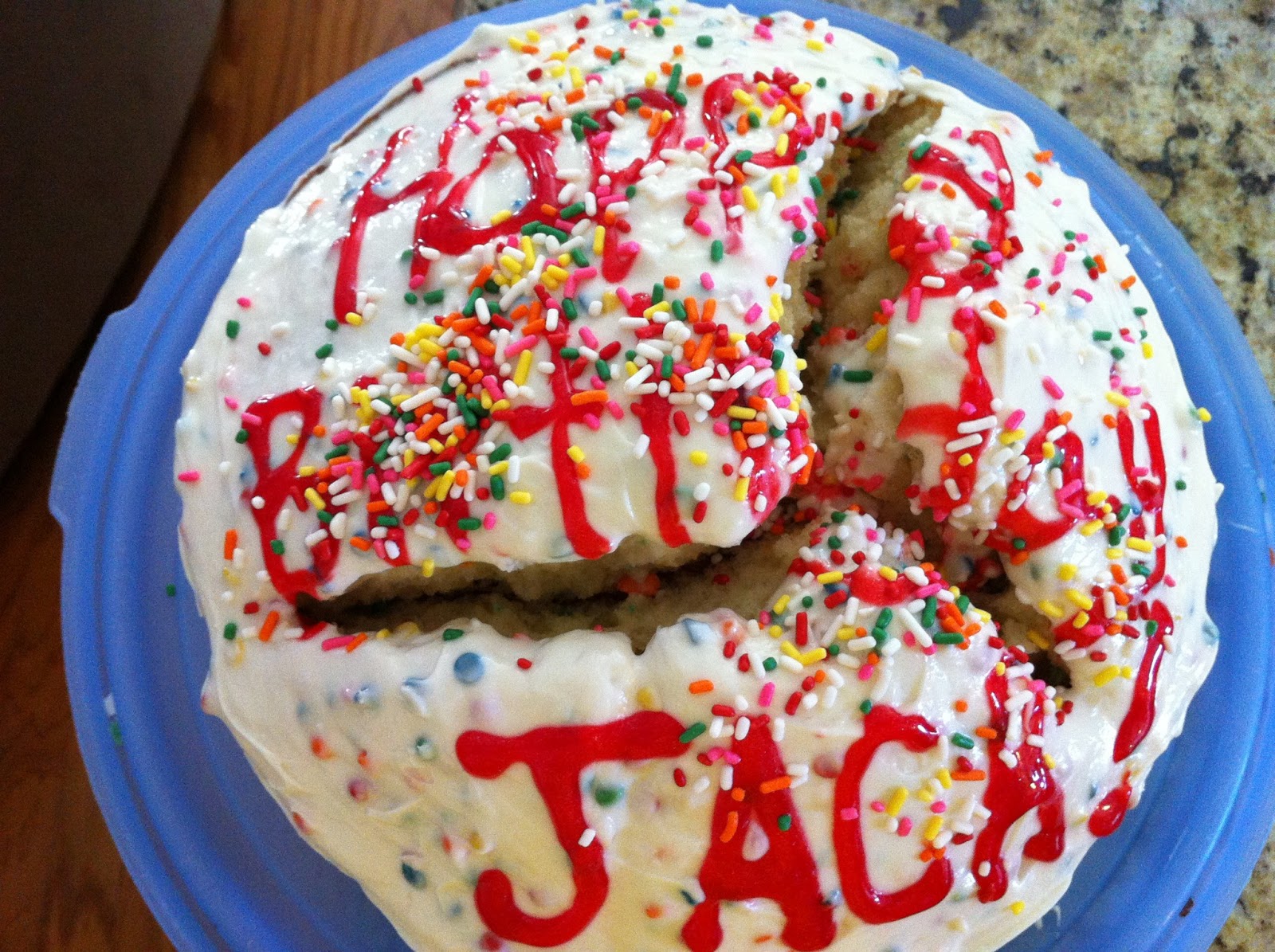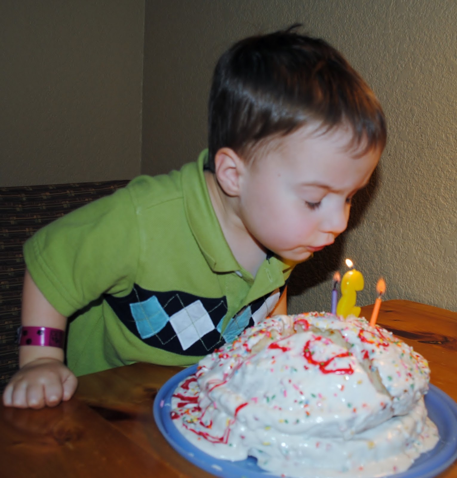 Jack has just recently started enjoying sweets. He wanted to help put the sprinkles on his cake. I made this cake the night before and I guess there was an earthquake or something. :) Somehow it split and ended up looking like a peace sign.
